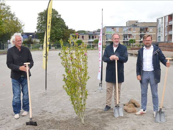 Wethouder Eelco Eikenaar plant samen met Nijestee-bestuurder Rein Swart en Trebbe-directeur Marinus den Harder de hibiscusstruik